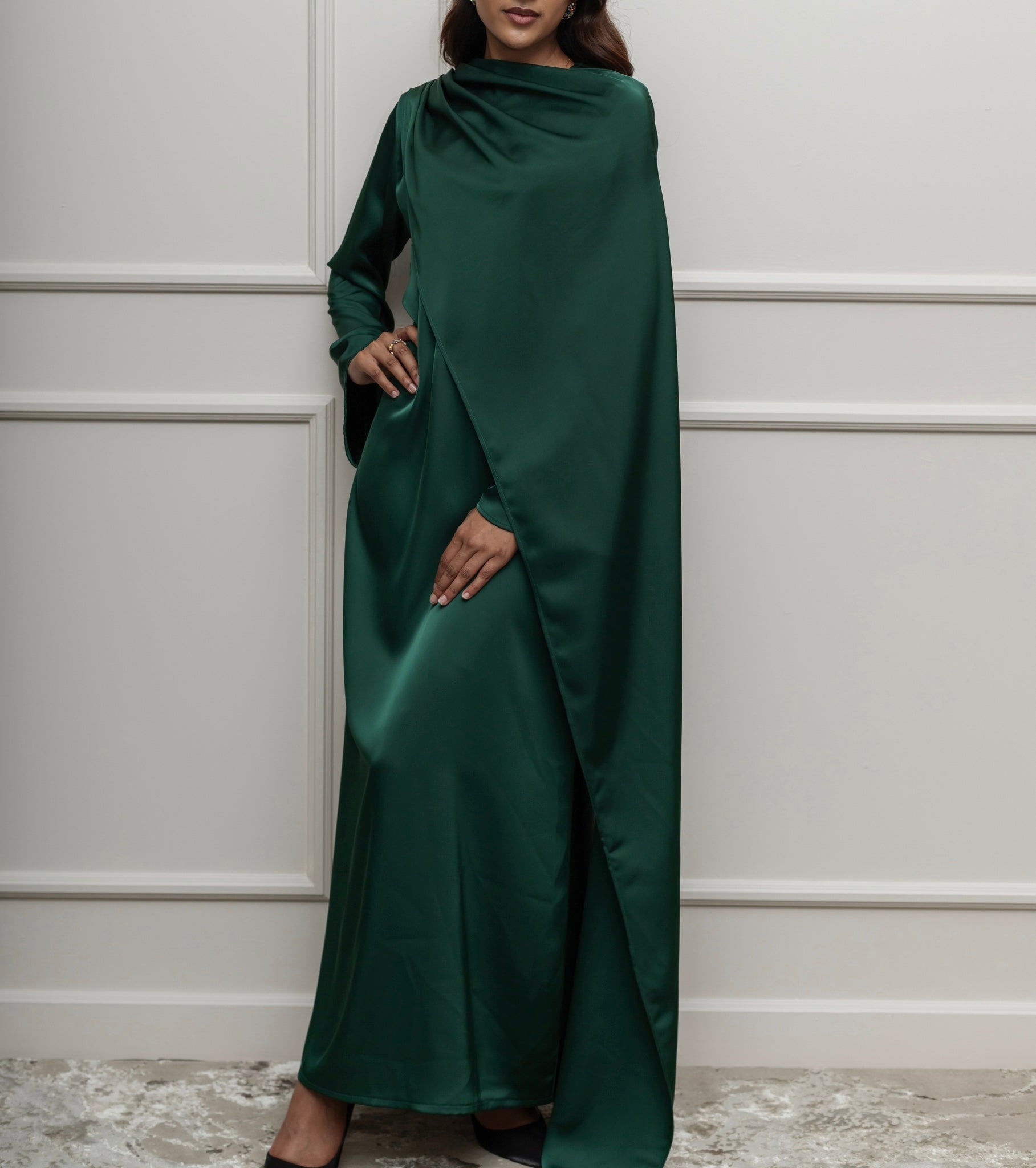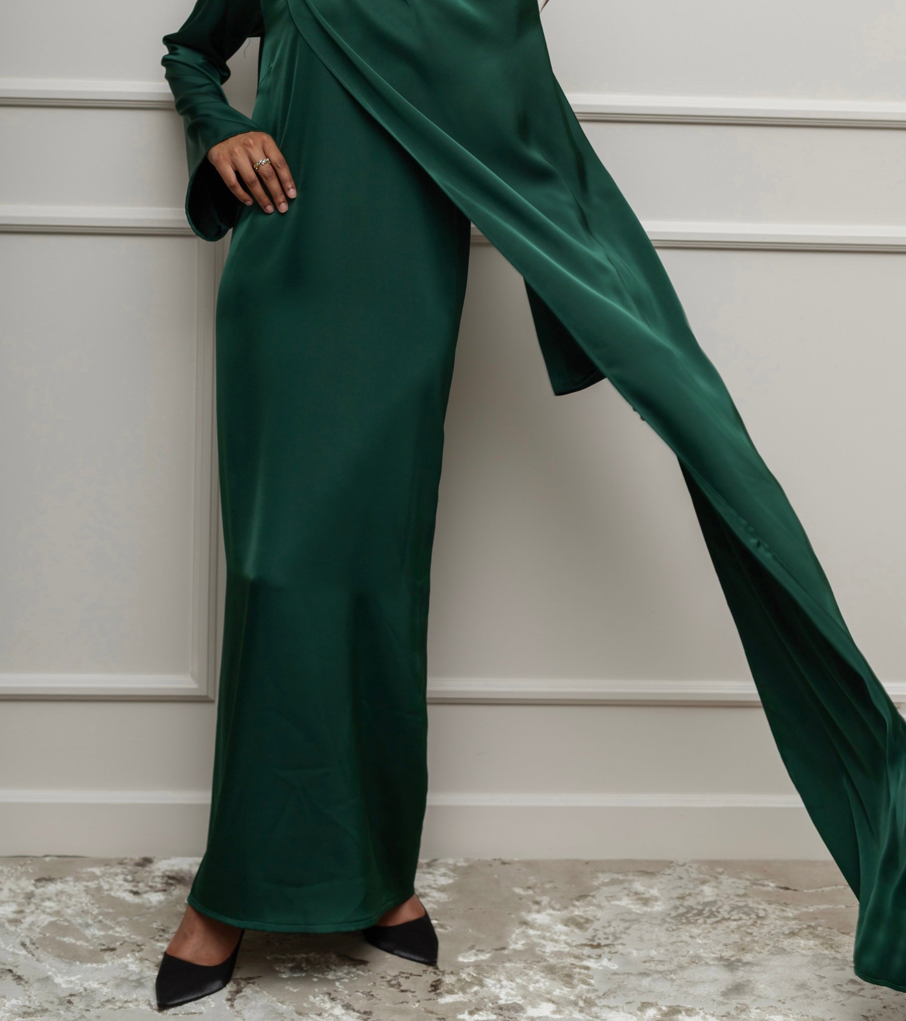 Alora features a dramatic, single-sided draped overlay that falls elegantly from the shoulder to the floor, paired with sleek, narrow sleeves for a sophisticated silhouette.