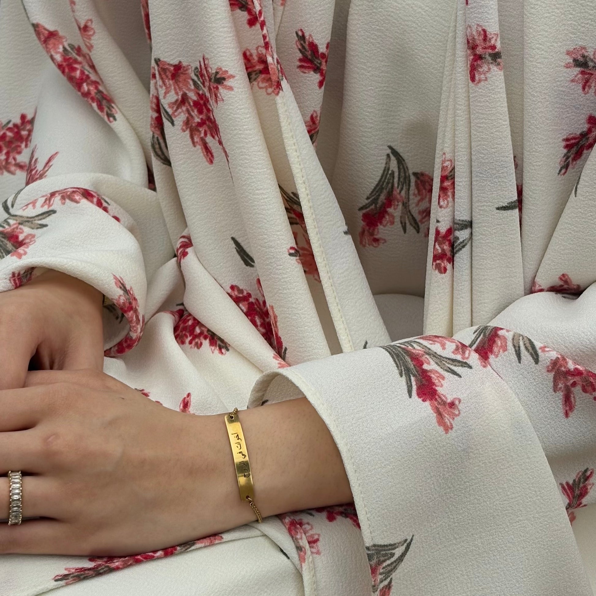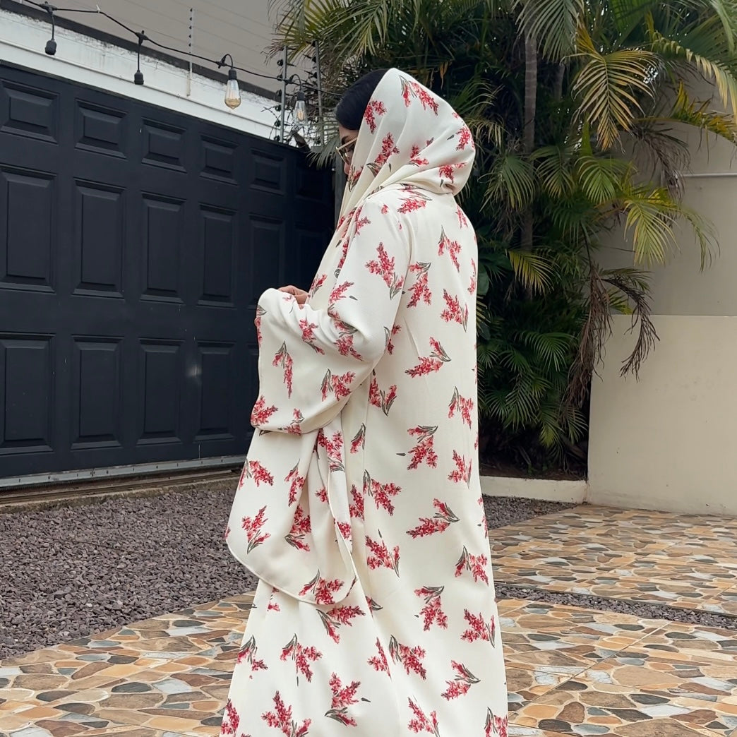 Adorned with crimson florals on a creamy base, this A-line open abaya with slightly wider sleeves captures the elegance of nature in full bloom