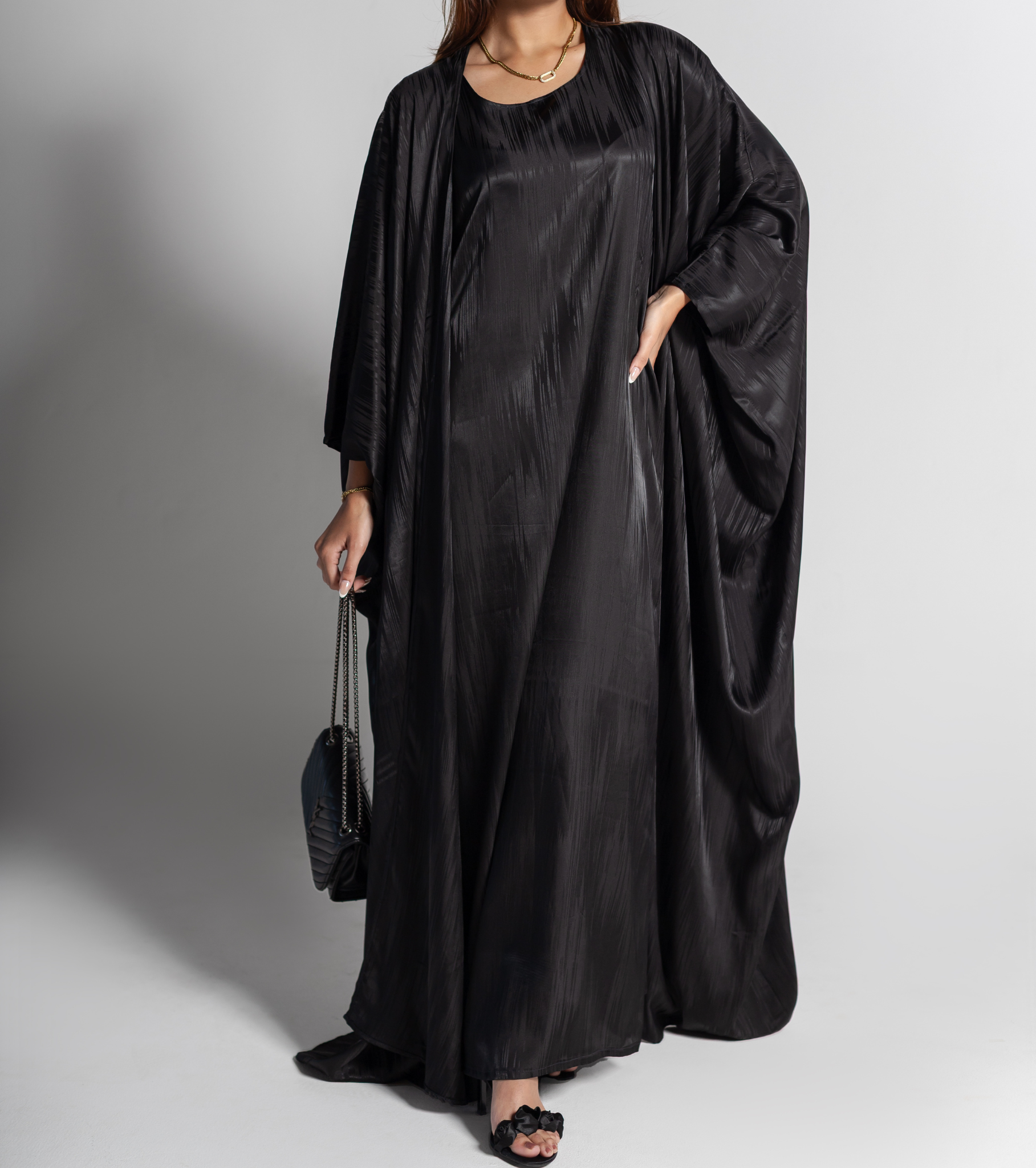 Designed using an imported Emirati fabric, each abaya set features a voluminous, cascading silhouette and comes with a free matching inner.