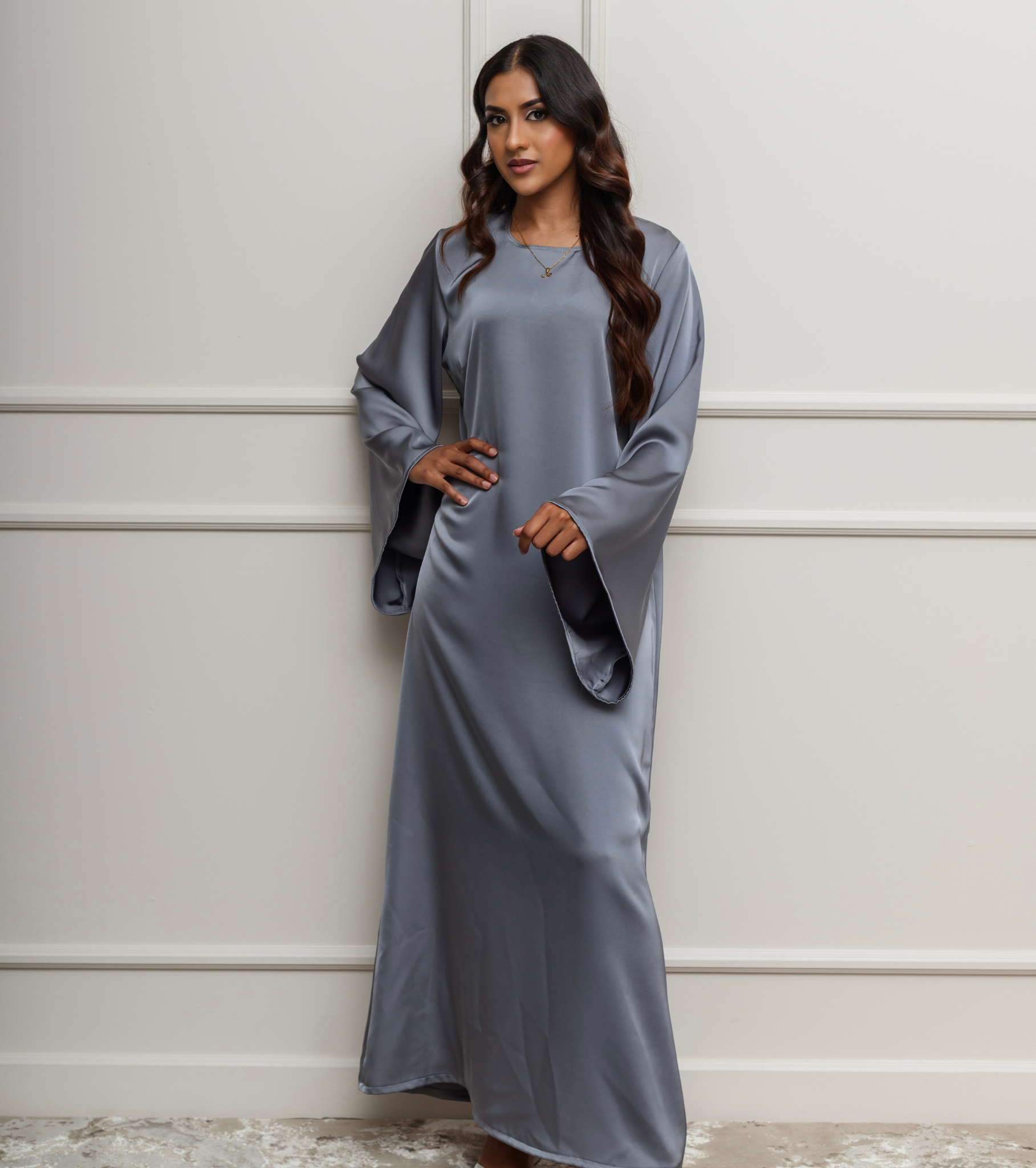 The Layan Abaya features a simple, flowing silhouette designed with elegant, wide sleeves for an effortless, modest look.